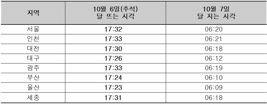 주요 도시별 달이 뜨는 시간은 부산 오후 5시 24분, 대구 오후 5시 26분, 대전 오후 5시 30분, 인천과 광주 오후 5시 33분입니다.