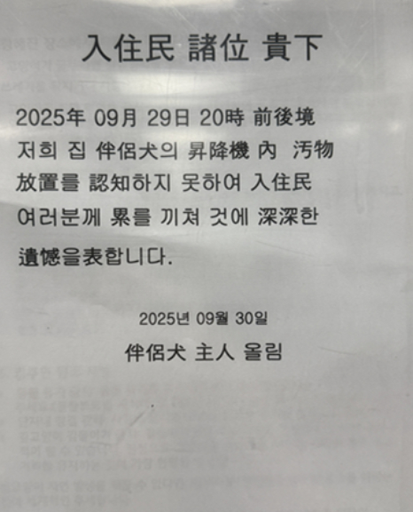 승강기에 대변 안 치우고 떠난 견주…민원 빗발치자 내건 '한자 사과문'