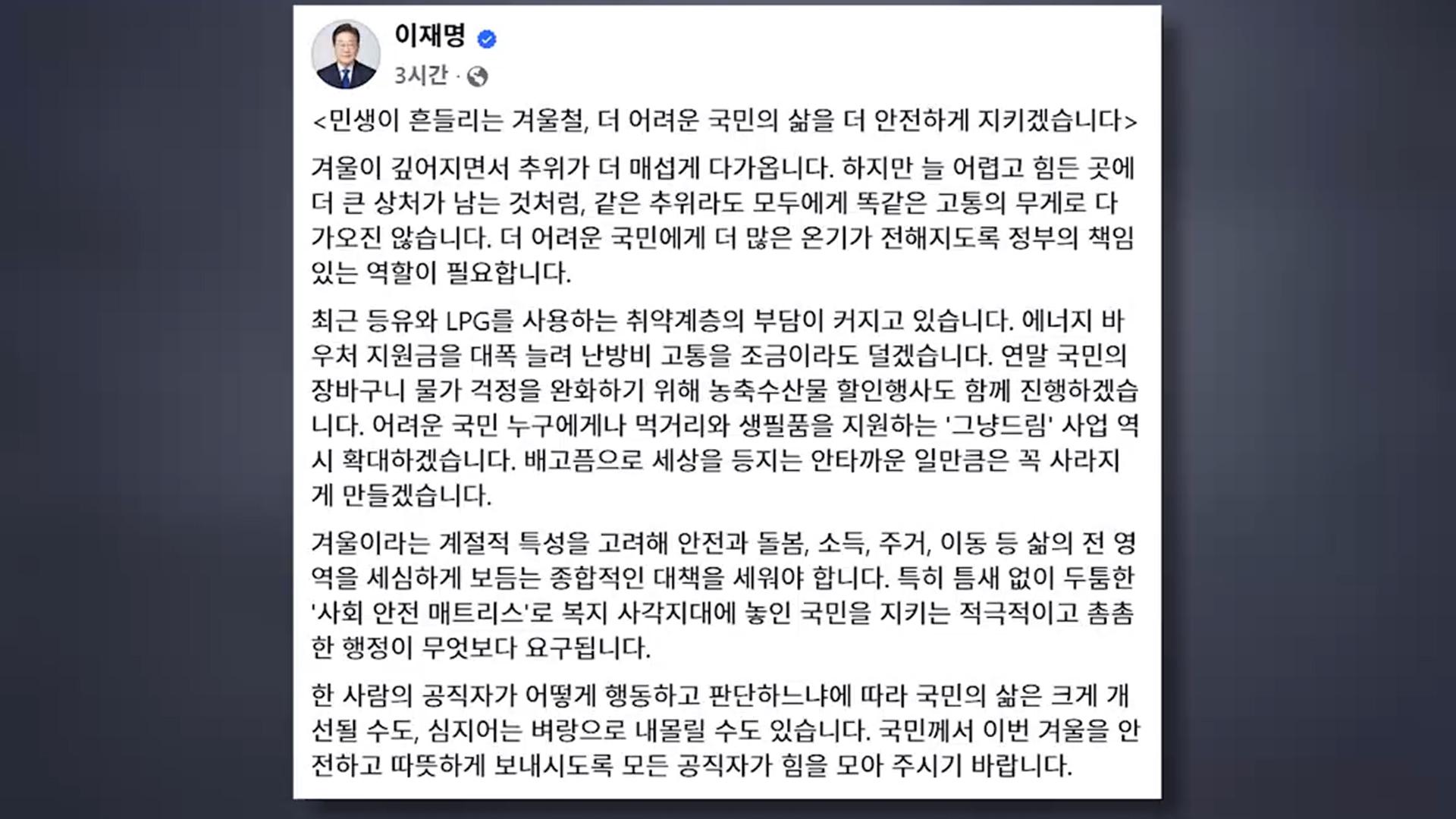 이 대통령 “겨울철 취약계층 난방비·먹거리 지원 확대"